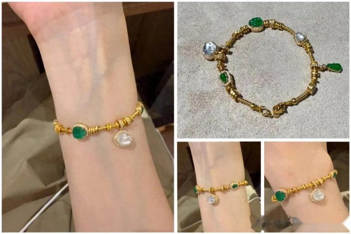 @gaga:近期超爱的一款黄金盘缠手链!翡翠+黄金组合绝了~每一个小滴溜都是自己喜欢的,翡翠小佛公、小福豆、小葫芦还有等了很久的如意叶子,加上黄金盘缠。